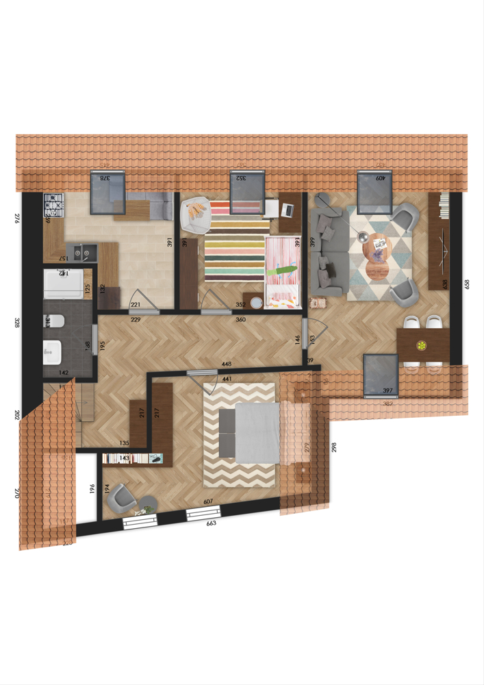 Die Ausstattung ist als durchweg hochwertig. Trendige, großformatige Fliesen, Parkett und eine moderne offene Küche mit namhaften Markengeräten sind verbaut bzw. installiert.